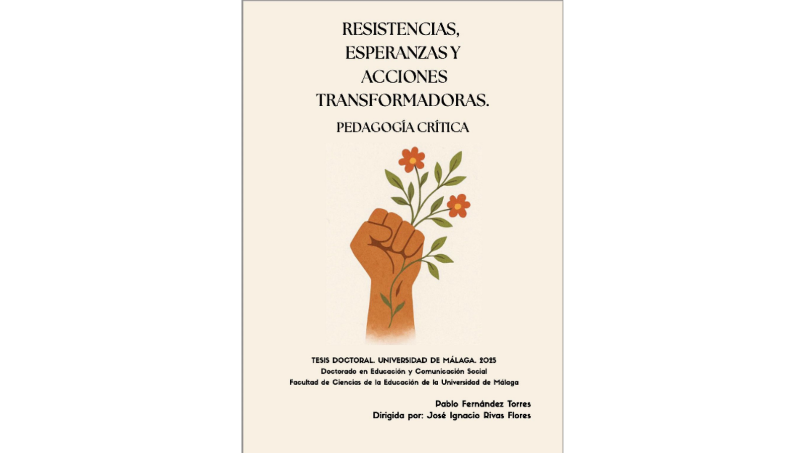 Fernández-Torres, Pablo. Resistencias, Esperanzas Y Acciones Transformadoras. Pedagogía Crítica Dirigido Por: Rivas-Flores, José Ignacio;. Universidad De Málaga. Facultad De Ciencias De La Educación. defendida el 05/09/2025. Calificación: Sobresaliente cum Laude. Mención Internacional